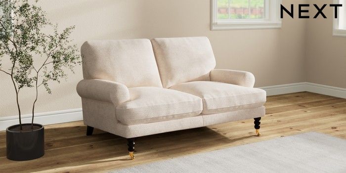 7.2.10 Erin Deep Relaxed Sit 2 Seater Small Sofa Boucle Chenille Oyster High Classic Turned Brass Castor - Dark | Made Click here to use our website with more accessibility support, for example screen readers