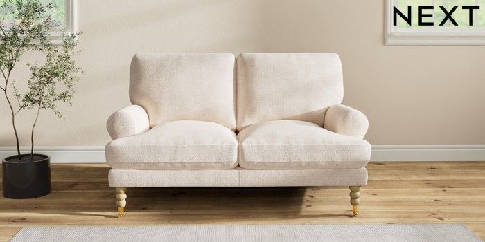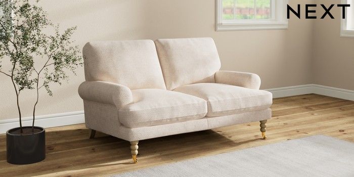 7.2.10 Erin Deep Relaxed Sit 2 Seater Small Sofa Boucle Chenille Oyster High Classic Turned Brass Castor - Light | Made Click here to use our website with more accessibility support, for example screen readers
