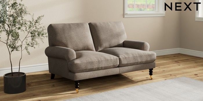 7.2.10 Erin Deep Relaxed Sit 2 Seater Small Sofa Chunky Weave Dark Natural High Classic Turned Brass Castor - Dark | Made Click here to use our website with more accessibility support, for example screen readers