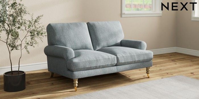 7.2.10 Erin Deep Relaxed Sit 2 Seater Small Sofa Chunky Weave Mid Blue High Classic Turned Brass Castor - Light | Made Click here to use our website with more accessibility support, for example screen readers