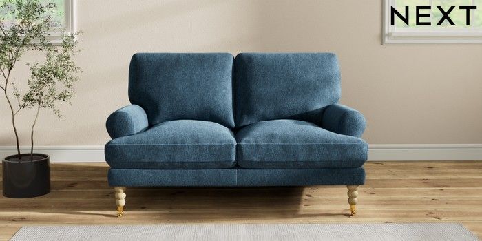 7.2.10 Erin Deep Relaxed Sit 2 Seater Small Sofa Cotswold Chenille Dark Blue High Classic Turned Brass Castor - Light | Made Click here to use our website with more accessibility support, for example screen readers