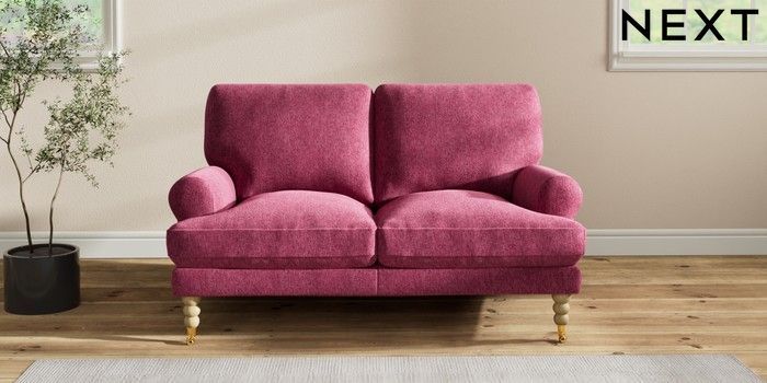 7.2.10 Erin Deep Relaxed Sit 2 Seater Small Sofa Cotswold Chenille Dark Raspberry Pink High Classic Turned Brass Castor - Light | Made Click here to use our website with more accessibility support, for example screen readers