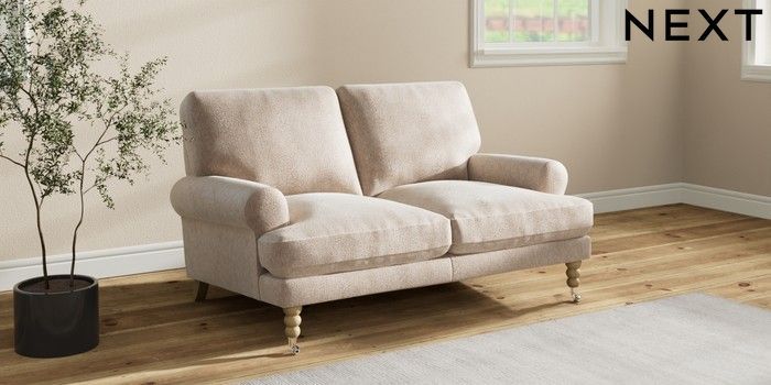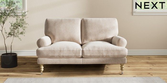7.2.10 Erin Deep Relaxed Sit 2 Seater Small Sofa Cotswold Chenille Light Natural High Classic Turned Chrome Castor - Light | Made Click here to use our website with more accessibility support, for example screen readers