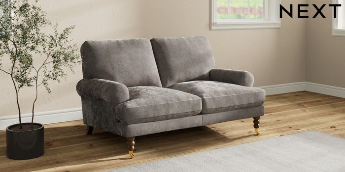 7.2.10 Erin Deep Relaxed Sit 2 Seater Small Sofa Distressed Velour French Grey High Classic Turned Brass Castor - Mid | Made Click here to use our website with more accessibility support, for example screen readers