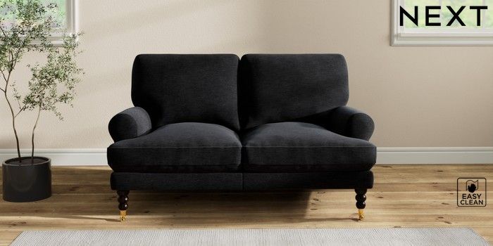 7.2.10 Erin Deep Relaxed Sit 2 Seater Small Sofa Fine Chenille Easy Clean Black High Classic Turned Brass Castor - Dark | Made Click here to use our website with more accessibility support, for example screen readers