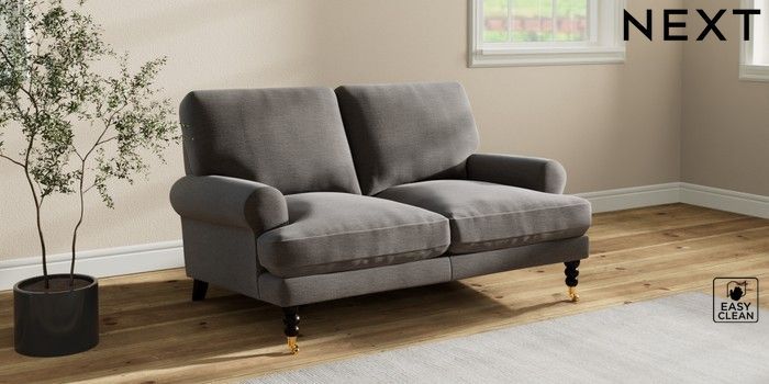 7.2.10 Erin Deep Relaxed Sit 2 Seater Small Sofa Fine Chenille Easy Clean Dark Smoke Grey High Classic Turned Brass Castor - Dark | Made Click here to use our website with more accessibility support, for example screen readers