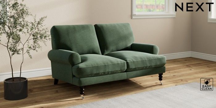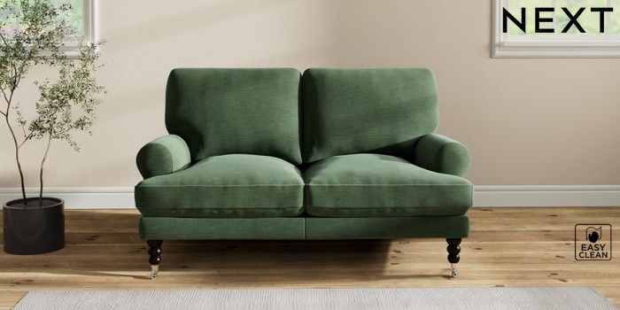 7.2.10 Erin Deep Relaxed Sit 2 Seater Small Sofa Fine Chenille Easy Clean Mid Khaki Green High Classic Turned Chrome Castor - Dark | Made Click here to use our website with more accessibility support, for example screen readers