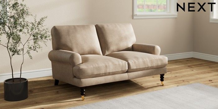 7.2.10 Erin Deep Relaxed Sit 2 Seater Small Sofa Luxe Chenille Mid Camel Beige High Classic Turned Brass Castor - Dark | Made Click here to use our website with more accessibility support, for example screen readers