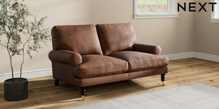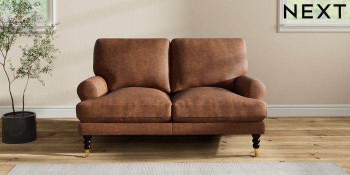 7.2.10 Erin Deep Relaxed Sit 2 Seater Small Sofa Monza Faux Leather Easy Clean Chestnut Brown High Classic Turned Brass Castor - Dark | Made Click here to use our website with more accessibility support, for example screen readers