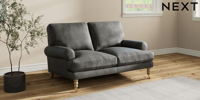 7.2.10 Erin Deep Relaxed Sit 2 Seater Small Sofa Monza Faux Leather Easy Clean Dark Grey High Classic Turned Brass Castor - Light | Made Click here to use our website with more accessibility support, for example screen readers