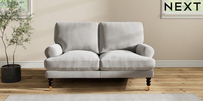 7.2.10 Erin Deep Relaxed Sit 2 Seater Small Sofa Natural Mix Light Grey High Classic Turned Brass Castor - Dark | Made Click here to use our website with more accessibility support, for example screen readers