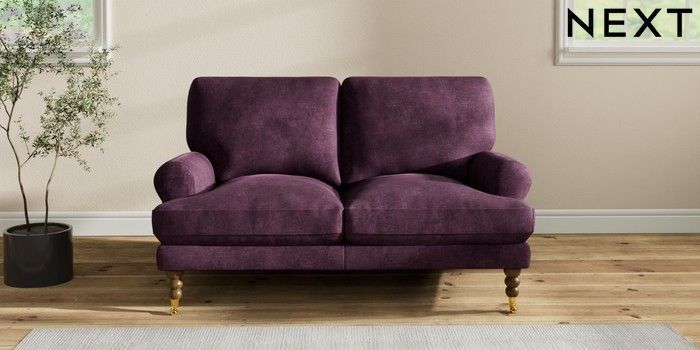 7.2.10 Erin Deep Relaxed Sit 2 Seater Small Sofa Plush Chenille Dark Plum Purple High Classic Turned Brass Castor - Mid | Made Click here to use our website with more accessibility support, for example screen readers
