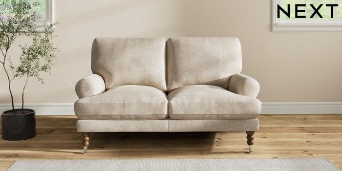7.2.10 Erin Deep Relaxed Sit 2 Seater Small Sofa Plush Chenille Light Natural High Classic Turned Chrome Castor - Mid | Made Click here to use our website with more accessibility support, for example screen readers
