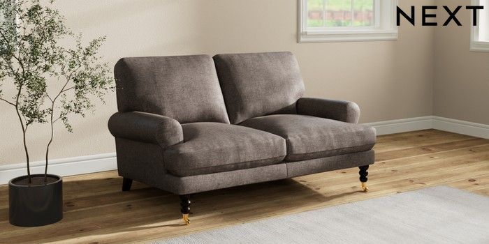 7.2.10 Erin Deep Relaxed Sit 2 Seater Small Sofa Plush Chenille Mink Brown High Classic Turned Brass Castor - Dark | Made Click here to use our website with more accessibility support, for example screen readers