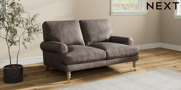 7.2.10 Erin Deep Relaxed Sit 2 Seater Small Sofa Plush Chenille Mink Brown High Classic Turned Brass Castor - Light | Made Click here to use our website with more accessibility support, for example screen readers
