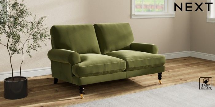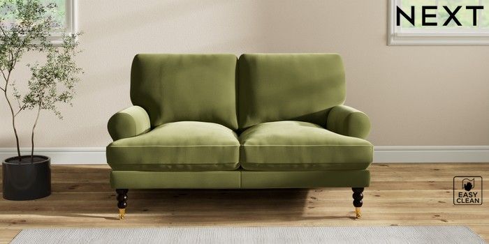 7.2.10 Erin Deep Relaxed Sit 2 Seater Small Sofa Plush Velvet Easy Clean Mid Olive Green High Classic Turned Brass Castor - Dark | Made Click here to use our website with more accessibility support, for example screen readers
