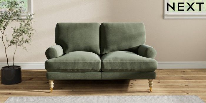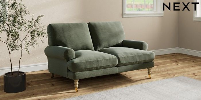 7.2.10 Erin Deep Relaxed Sit 2 Seater Small Sofa Relaxed Linen Look Dark Green High Classic Turned Brass Castor - Light | Made Click here to use our website with more accessibility support, for example screen readers