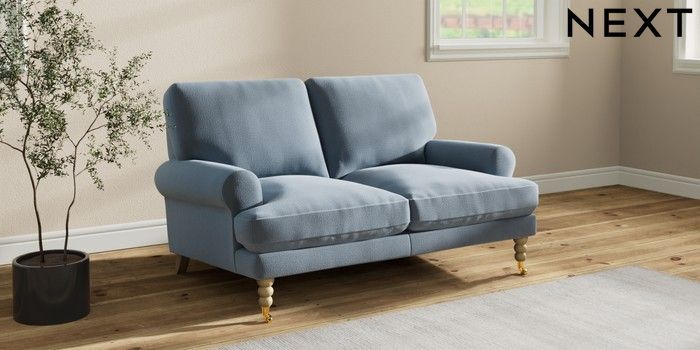 7.2.10 Erin Deep Relaxed Sit 2 Seater Small Sofa Relaxed Linen Look Mid Blue High Classic Turned Brass Castor - Light | Made Click here to use our website with more accessibility support, for example screen readers