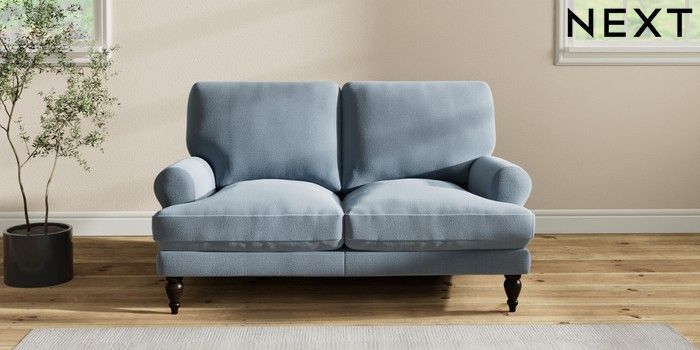 7.2.10 Erin Deep Relaxed Sit 2 Seater Small Sofa Relaxed Linen Look Mid Blue High Classic Turned - Dark | Made Click here to use our website with more accessibility support, for example screen readers