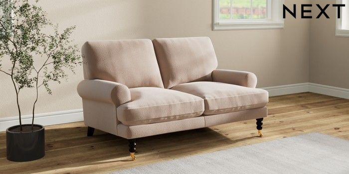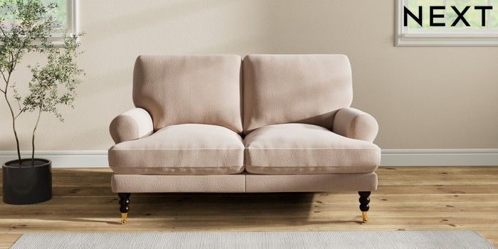7.2.10 Erin Deep Relaxed Sit 2 Seater Small Sofa Relaxed Linen Look Mid Natural High Classic Turned Brass Castor - Dark | Made Click here to use our website with more accessibility support, for example screen readers