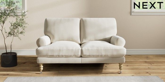 7.2.10 Erin Deep Relaxed Sit 2 Seater Small Sofa Relaxed Linen Look Oyster High Classic Turned Chrome Castor - Light | Made Click here to use our website with more accessibility support, for example screen readers