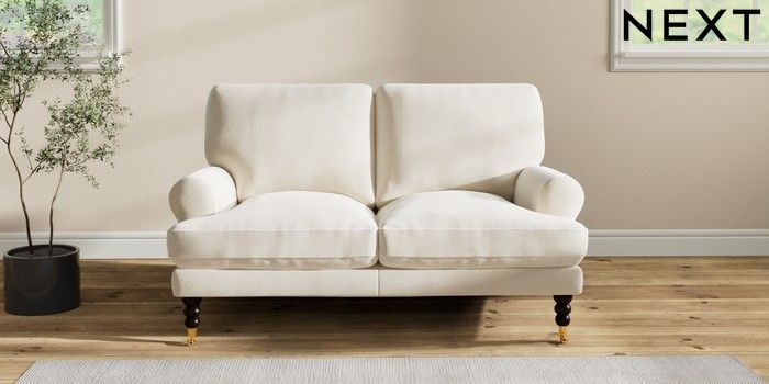 7.2.10 Erin Deep Relaxed Sit 2 Seater Small Sofa Ripple Chenille Oyster High Classic Turned Brass Castor - Dark | Made Click here to use our website with more accessibility support, for example screen readers