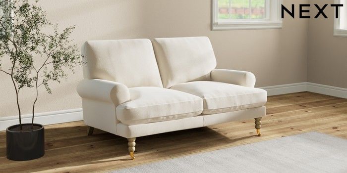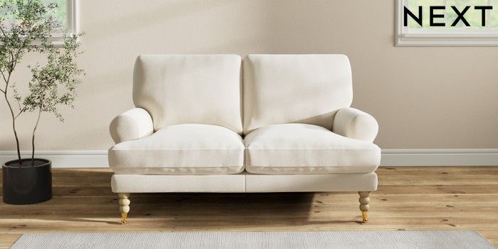 7.2.10 Erin Deep Relaxed Sit 2 Seater Small Sofa Ripple Chenille Oyster High Classic Turned Brass Castor - Light | Made Click here to use our website with more accessibility support, for example screen readers