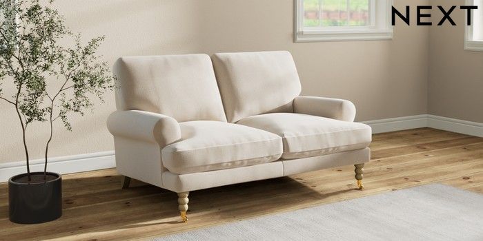 7.2.10 Erin Deep Relaxed Sit 2 Seater Small Sofa Studio Chenille Oyster High Classic Turned Brass Castor - Light | Made Click here to use our website with more accessibility support, for example screen readers