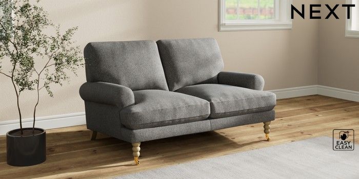 7.2.10 Erin Deep Relaxed Sit 2 Seater Small Sofa Tweedy Blend Easy Clean Dark Grey High Classic Turned Brass Castor - Light | Made Click here to use our website with more accessibility support, for example screen readers