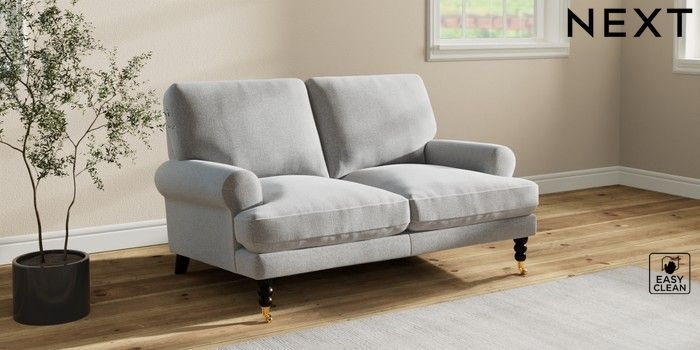 7.2.10 Erin Deep Relaxed Sit 2 Seater Small Sofa Tweedy Blend Easy Clean Light Silver Grey High Classic Turned Brass Castor - Dark | Made Click here to use our website with more accessibility support, for example screen readers