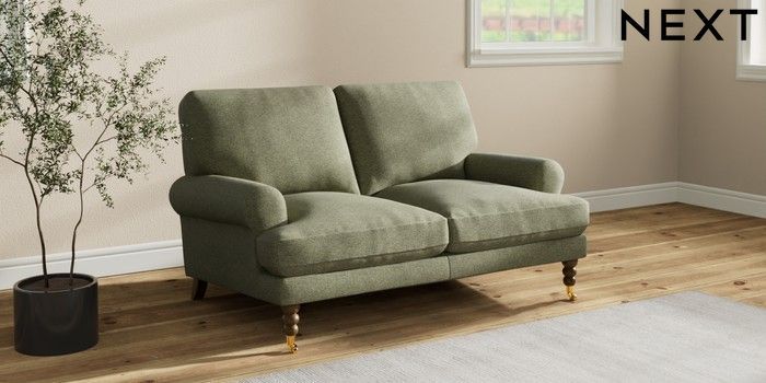 7.2.10 Erin Deep Relaxed Sit 2 Seater Small Sofa Tweedy Chenille Mid Moss Green High Classic Turned Brass Castor - Mid | Made Click here to use our website with more accessibility support, for example screen readers