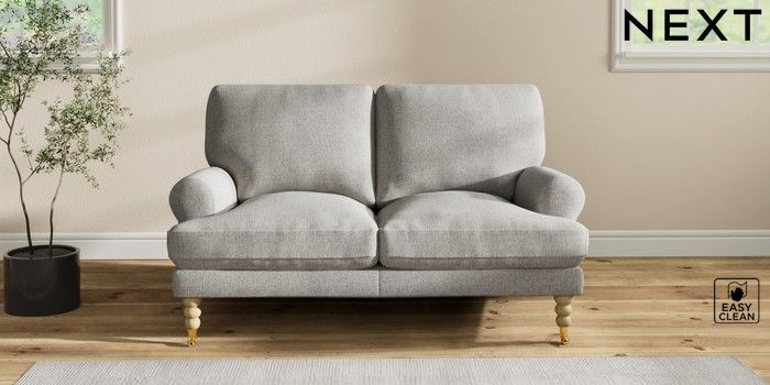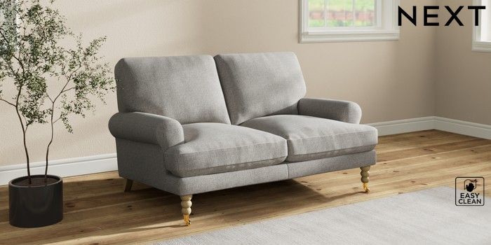 7.2.10 Erin Deep Relaxed Sit 2 Seater Small Sofa Woven Chenille Easy Clean Light Grey High Classic Turned Brass Castor - Light | Made Click here to use our website with more accessibility support, for example screen readers