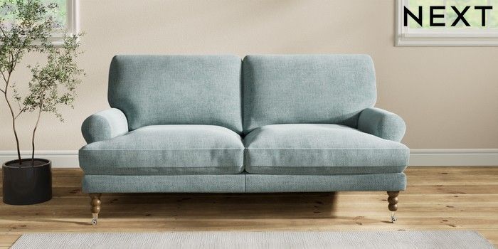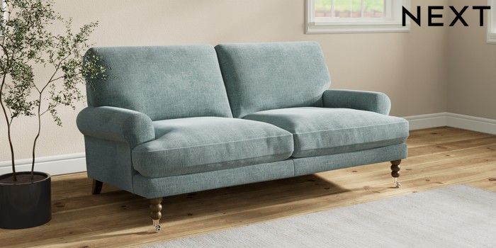 7.2.10 Erin Deep Relaxed Sit 3 Seater Small Sofa Chunky Chenille Light Teal Green High Classic Turned Chrome Castor - Mid | Made Click here to use our website with more accessibility support, for example screen readers