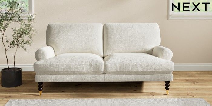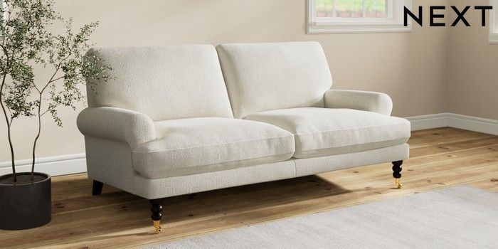 7.2.10 Erin Deep Relaxed Sit 3 Seater Small Sofa Chunky Texture Oyster High Classic Turned Brass Castor - Dark | Made Click here to use our website with more accessibility support, for example screen readers