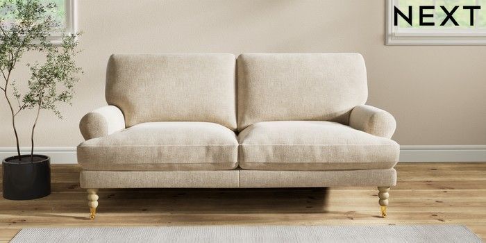 7.2.10 Erin Deep Relaxed Sit 3 Seater Small Sofa Chunky Weave Cream High Classic Turned Brass Castor - Light | Made Click here to use our website with more accessibility support, for example screen readers