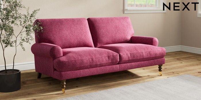 7.2.10 Erin Deep Relaxed Sit 3 Seater Small Sofa Cotswold Chenille Dark Raspberry Pink High Classic Turned Brass Castor - Mid | Made Click here to use our website with more accessibility support, for example screen readers