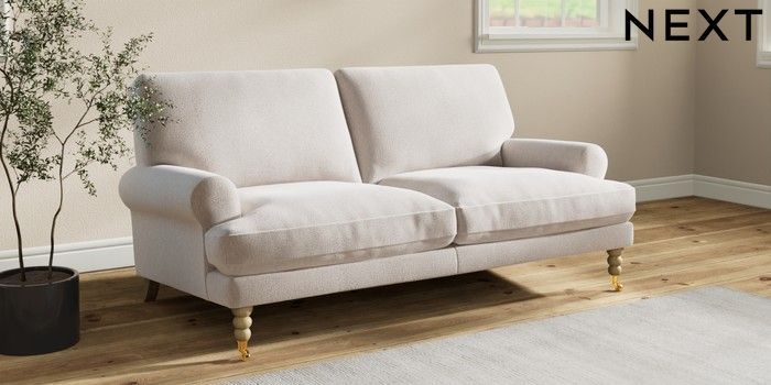 7.2.10 Erin Deep Relaxed Sit 3 Seater Small Sofa Cotswold Chenille Oyster High Classic Turned Brass Castor - Light | Made Click here to use our website with more accessibility support, for example screen readers