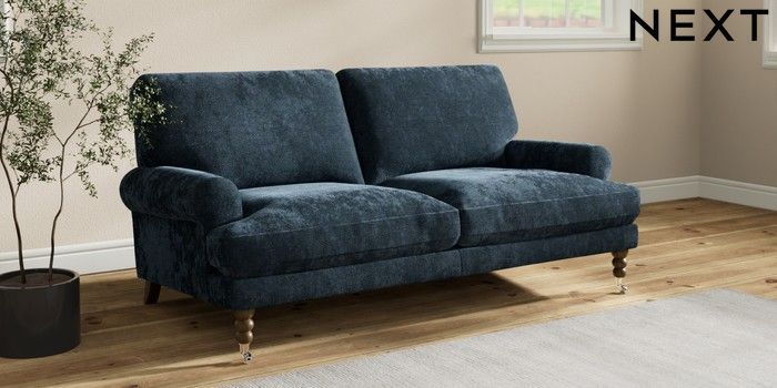 7.2.10 Erin Deep Relaxed Sit 3 Seater Small Sofa Distressed Velour Midnight Blue High Classic Turned Chrome Castor - Mid | Made Click here to use our website with more accessibility support, for example screen readers