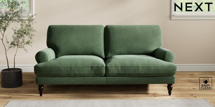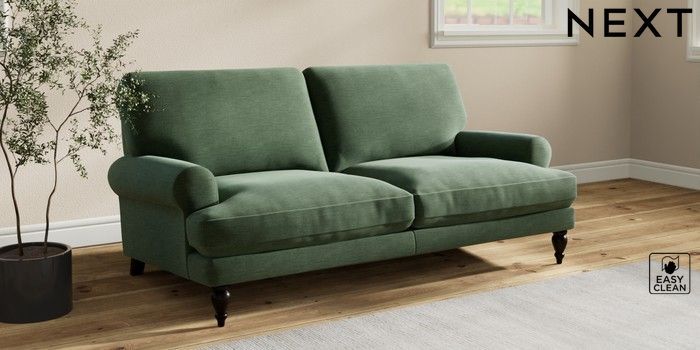 7.2.10 Erin Deep Relaxed Sit 3 Seater Small Sofa Fine Chenille Easy Clean Mid Khaki Green High Classic Turned - Dark | Made Click here to use our website with more accessibility support, for example screen readers