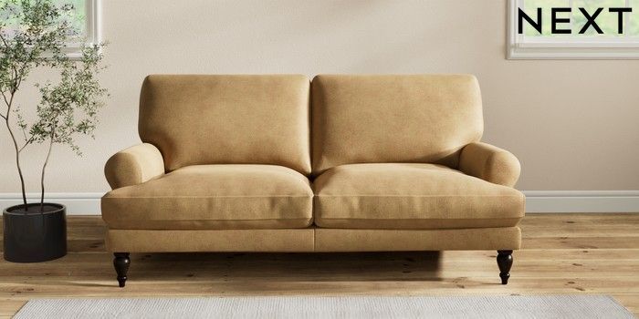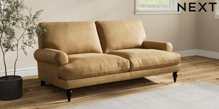 7.2.10 Erin Deep Relaxed Sit 3 Seater Small Sofa Luxe Chenille Honey Yellow High Classic Turned - Dark | Made Click here to use our website with more accessibility support, for example screen readers