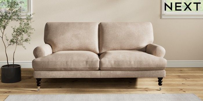 7.2.10 Erin Deep Relaxed Sit 3 Seater Small Sofa Plush Chenille Mid Natural High Classic Turned Chrome Castor - Dark | Made Click here to use our website with more accessibility support, for example screen readers