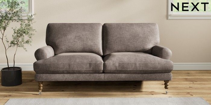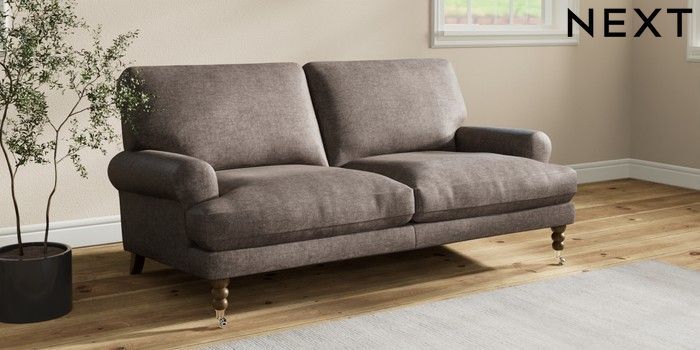 7.2.10 Erin Deep Relaxed Sit 3 Seater Small Sofa Plush Chenille Mink Brown High Classic Turned Chrome Castor - Mid | Made Click here to use our website with more accessibility support, for example screen readers