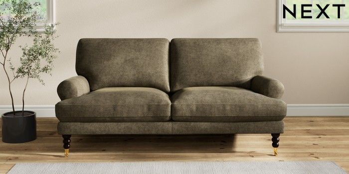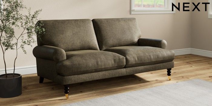 7.2.10 Erin Deep Relaxed Sit 3 Seater Small Sofa Plush Chenille Moss Green High Classic Turned Brass Castor - Dark | Made Click here to use our website with more accessibility support, for example screen readers