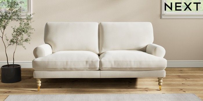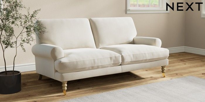7.2.10 Erin Deep Relaxed Sit 3 Seater Small Sofa Relaxed Linen Look Oyster High Classic Turned Brass Castor - Light | Made Click here to use our website with more accessibility support, for example screen readers
