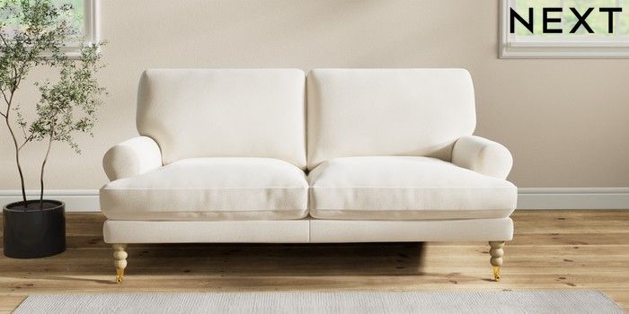 7.2.10 Erin Deep Relaxed Sit 3 Seater Small Sofa Ripple Chenille Oyster High Classic Turned Brass Castor - Light | Made Click here to use our website with more accessibility support, for example screen readers