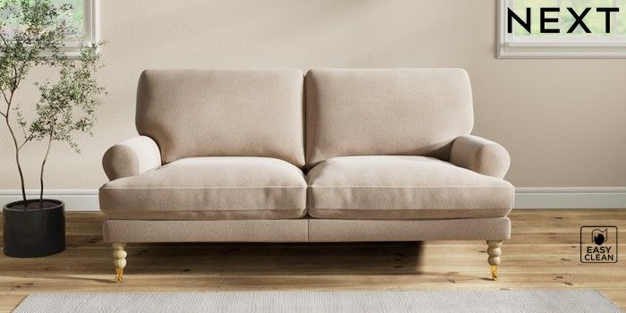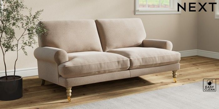 7.2.10 Erin Deep Relaxed Sit 3 Seater Small Sofa Tweedy Blend Easy Clean Light Dove Natural High Classic Turned Brass Castor - Light | Made Click here to use our website with more accessibility support, for example screen readers