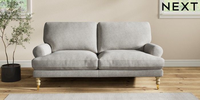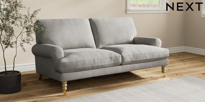 7.2.10 Erin Deep Relaxed Sit 3 Seater Small Sofa Tweedy Chenille Mid Grey High Classic Turned Brass Castor - Light | Made Click here to use our website with more accessibility support, for example screen readers