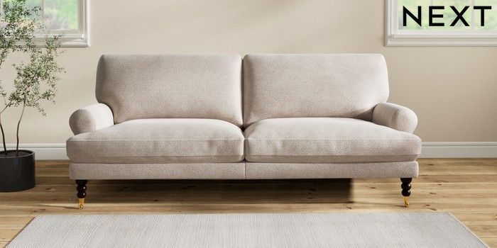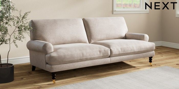 7.2.10 Erin Deep Relaxed Sit 3 Seater Sofa Boucle Chenille Light Natural High Classic Turned Brass Castor - Dark | Made Click here to use our website with more accessibility support, for example screen readers