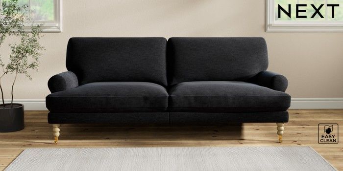7.2.10 Erin Deep Relaxed Sit 3 Seater Sofa Fine Chenille Easy Clean Black High Classic Turned Brass Castor - Light | Made Click here to use our website with more accessibility support, for example screen readers