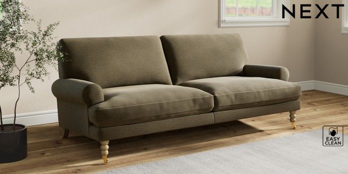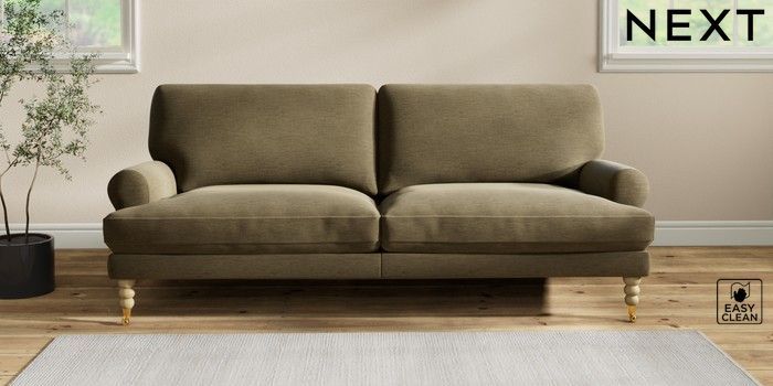 7.2.10 Erin Deep Relaxed Sit 3 Seater Sofa Fine Chenille Easy Clean Dark Moss Green High Classic Turned Brass Castor - Light | Made Click here to use our website with more accessibility support, for example screen readers